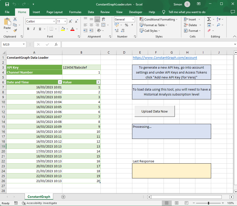 Once you have your API Key enter it into the spreadsheet, add your data including the date/time and values and click the Upload Data Now button.